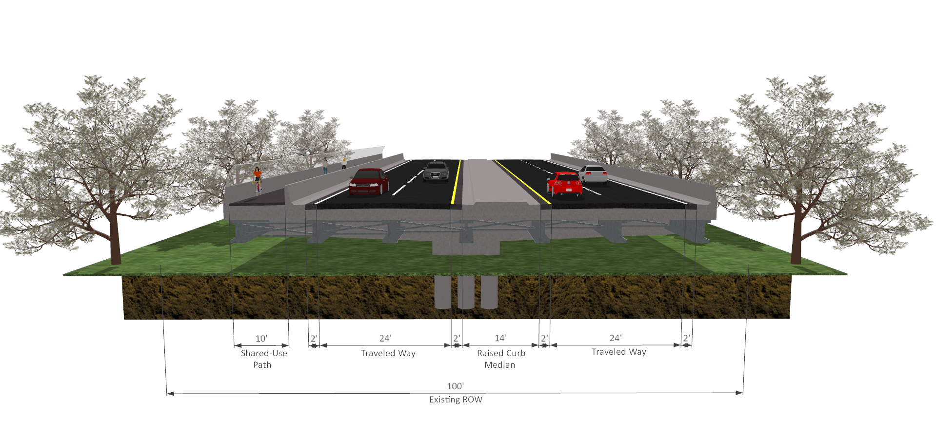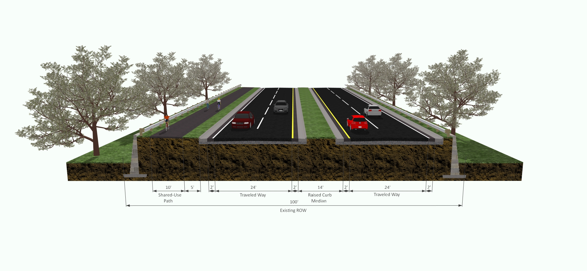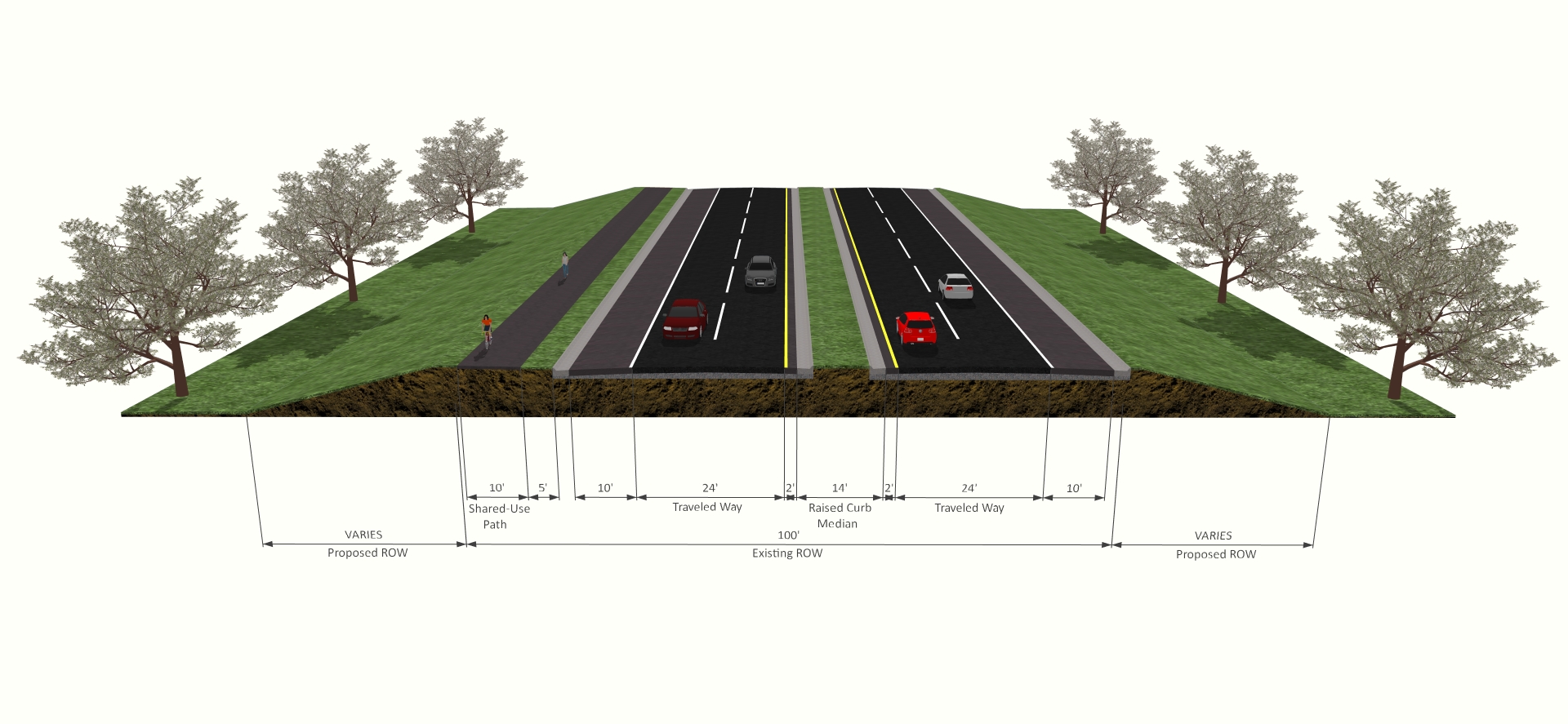 These refinements have led to a Preferred Alternative that satisfies the Purpose and Need while minimizing impacts to the surrounding environment by incorporating a combination of three typical sections. All three typical sections include four (4) travel lanes, paved shoulders, mountable curbs, closed drainage, and a shared-use path. The Preferred Alternative is divided into two segments due to the differences in land use and the environmental resources as shown in the following figures.